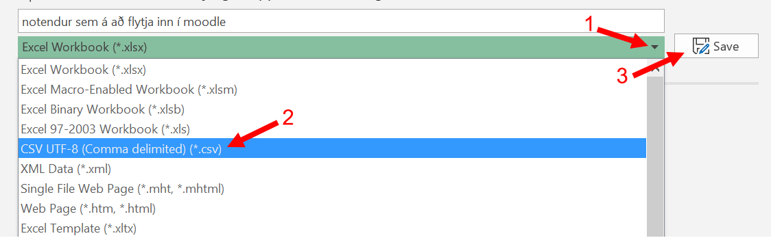 - að opna skrána í Excel, afrita reitina sem innihalda upplýsingarnar og líma inn í Notepad. Vista skrána sem csv (setja .csv fyrir aftan heiti), velja UTF-8 við Encoding og gera aðra tilraun með innlestur í Moodle.